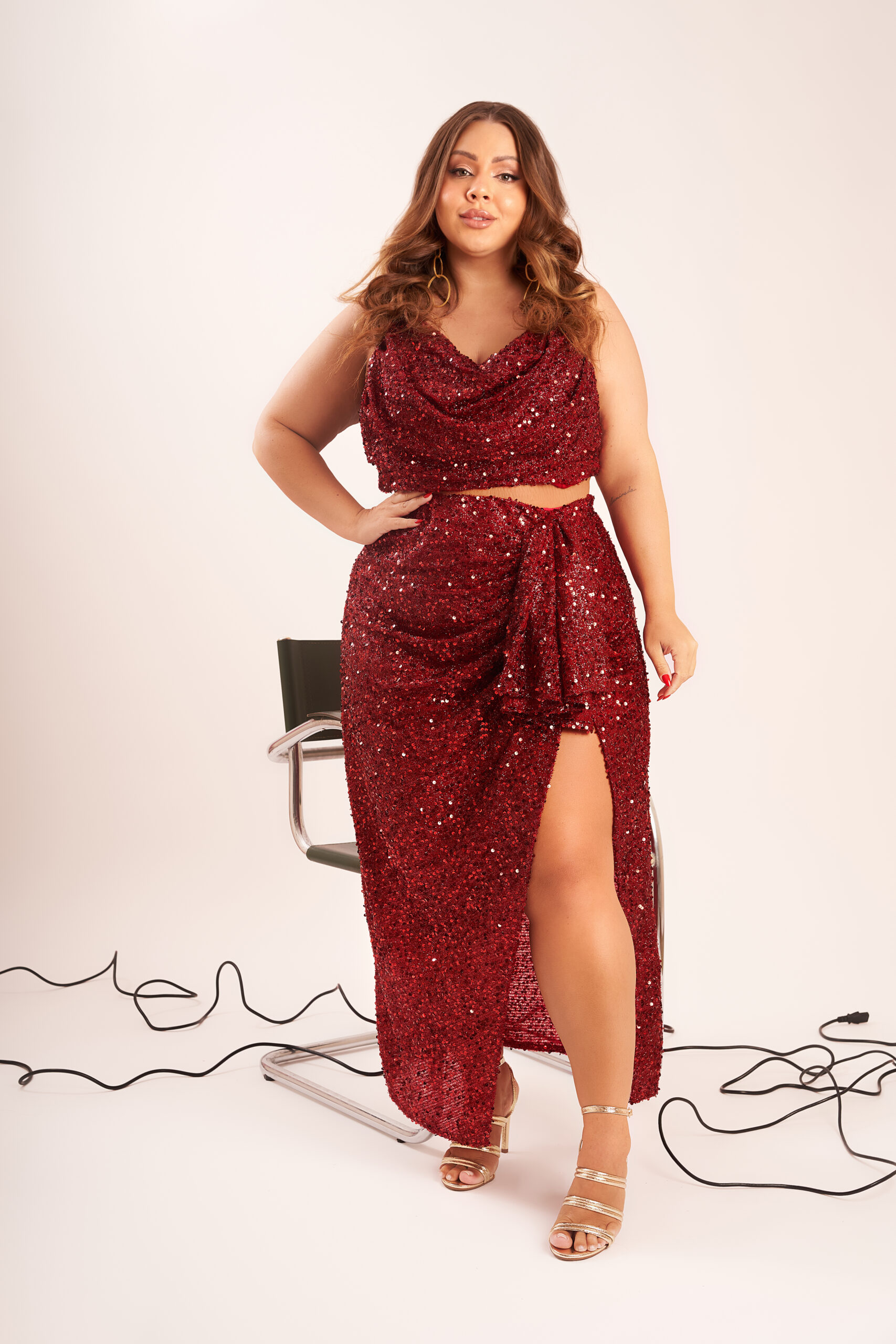 Conjunto Ariana! Luxo e poder representam esse look! Top com decote degadê e alças finas, saia midi com fenda e nó, todo em paetê que não pinica, super confortável!! Você vai brilhar e muito!!!